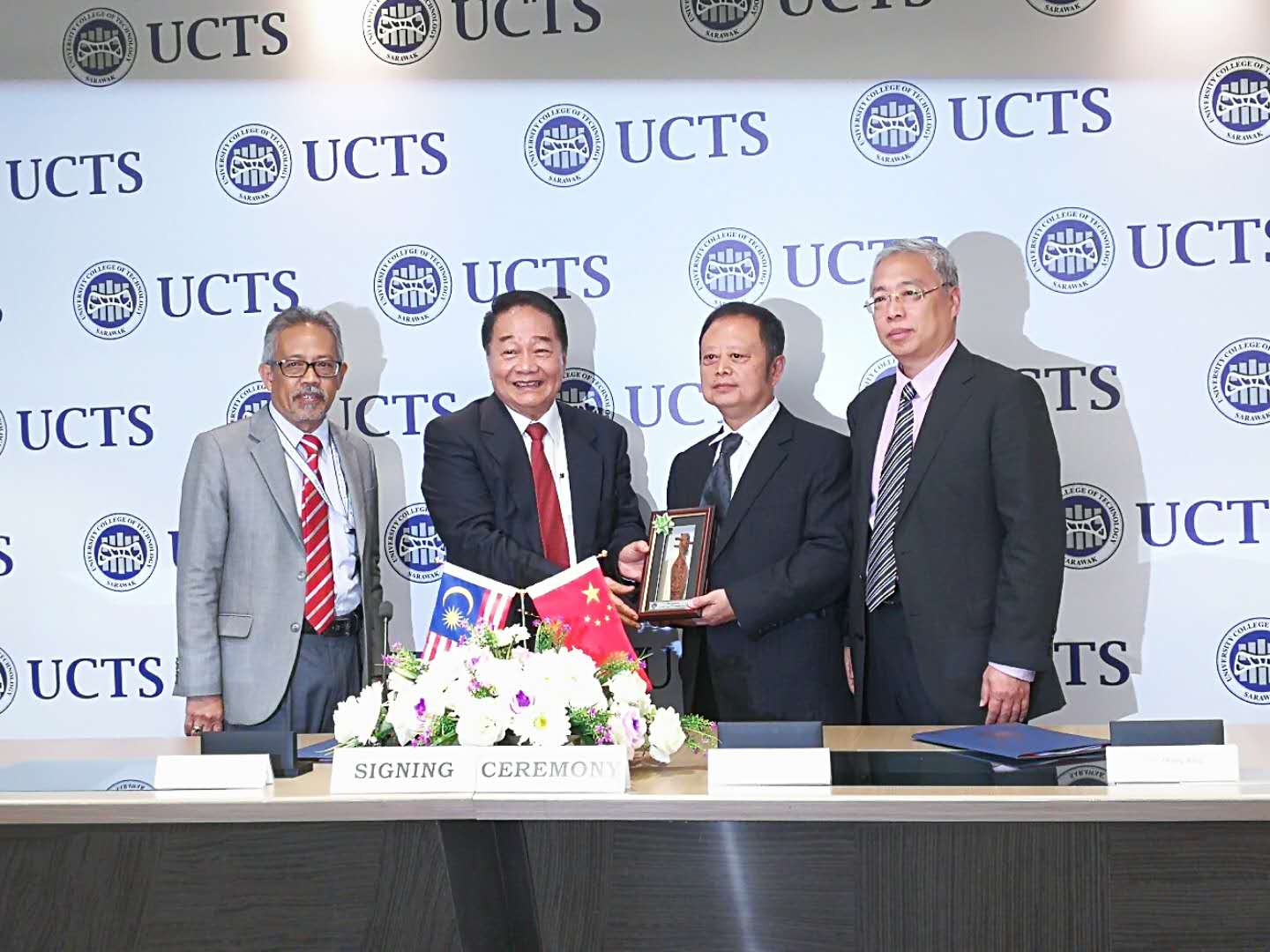 (左起为UCTS校长沙峇鲁丁哈末、马来西亚国会议员兼财政部长黄顺舸、四川省商务发展协会会长陈黎阳、砂拉越汉普发展有限公司首席执行员韩乃志)